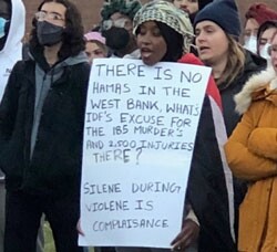 Evidence of professional agit-prop organizations was visible in the protestors’ signs. Black lettering on a yellow background provided by the A.N.S.W.E.R. Coalition proclaimed that “RESISTANCE IS JUSTIFIED WHEN PEOPLE ARE OCCUPIED.” Black lettering against a white background provided by the Party for Socialism and Liberation proclaimed that “RESISTANCE AGAINST OCCUPATION IS A HUMAN RIGHT!”